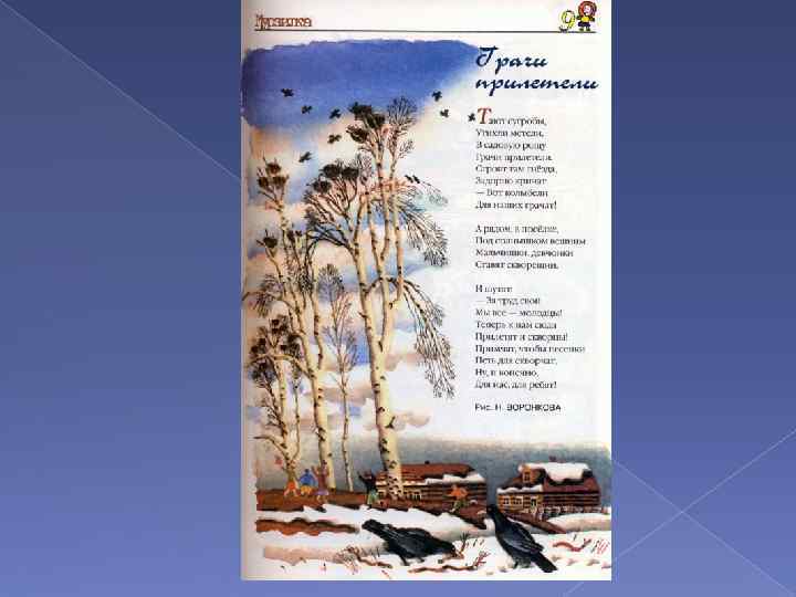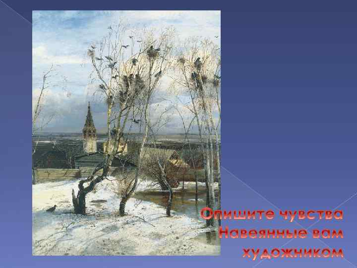Картина А. Саврасова «Грачи прилетели» . Словно звучит музыкой весны — звоном капели, журчаньем воды в проталинах, шорохом ветвей берез и грачиными криками.