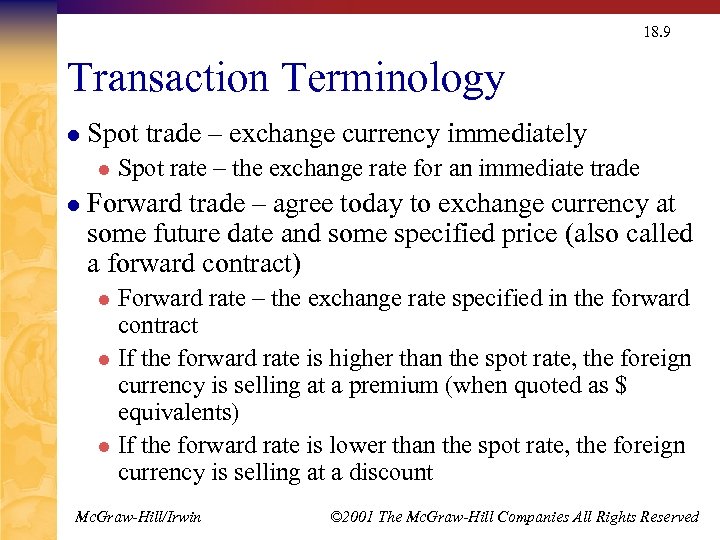 18. 9 Transaction Terminology l Spot trade – exchange currency immediately l l Spot rate – the exchange rate for an immediate trade Forward trade – agree today to exchange currency at some future date and some specified price (also called a forward contract) Forward rate – the exchange rate specified in the forward contract l If the forward rate is higher than the spot rate, the foreign currency is selling at a premium (when quoted as $ equivalents) l If the forward rate is lower than the spot rate, the foreign currency is selling at a discount l Mc. Graw-Hill/Irwin © 2001 The Mc. Graw-Hill Companies All Rights Reserved