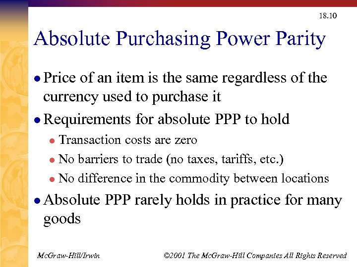 18. 10 Absolute Purchasing Power Parity l Price of an item is the same regardless of the currency used to purchase it l Requirements for absolute PPP to hold Transaction costs are zero l No barriers to trade (no taxes, tariffs, etc. ) l No difference in the commodity between locations l l Absolute PPP rarely holds in practice for many goods Mc. Graw-Hill/Irwin © 2001 The Mc. Graw-Hill Companies All Rights Reserved