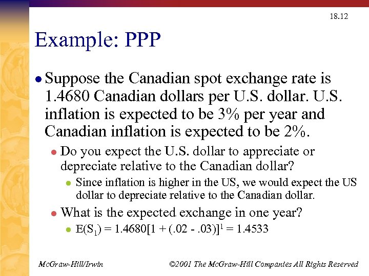18. 12 Example: PPP l Suppose the Canadian spot exchange rate is 1. 4680 Canadian dollars per U. S. dollar. U. S. inflation is expected to be 3% per year and Canadian inflation is expected to be 2%. l Do you expect the U. S. dollar to appreciate or depreciate relative to the Canadian dollar? l l Since inflation is higher in the US, we would expect the US dollar to depreciate relative to the Canadian dollar. What is the expected exchange in one year? l E(S 1) = 1. 4680[1 + (. 02 -. 03)]1 = 1. 4533 Mc. Graw-Hill/Irwin © 2001 The Mc. Graw-Hill Companies All Rights Reserved