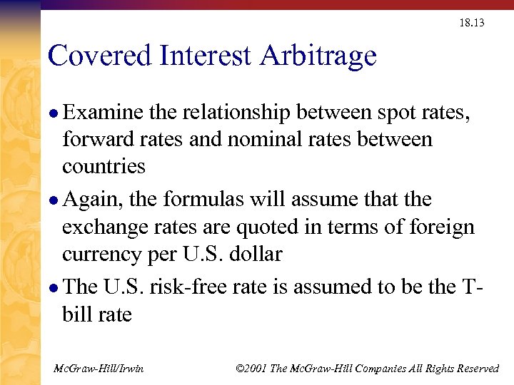 18. 13 Covered Interest Arbitrage l Examine the relationship between spot rates, forward rates and nominal rates between countries l Again, the formulas will assume that the exchange rates are quoted in terms of foreign currency per U. S. dollar l The U. S. risk-free rate is assumed to be the Tbill rate Mc. Graw-Hill/Irwin © 2001 The Mc. Graw-Hill Companies All Rights Reserved