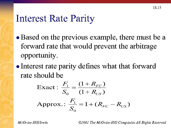 18. 15 Interest Rate Parity l Based on the previous example, there must be a forward rate that would prevent the arbitrage opportunity. l Interest rate parity defines what that forward rate should be Mc. Graw-Hill/Irwin © 2001 The Mc. Graw-Hill Companies All Rights Reserved