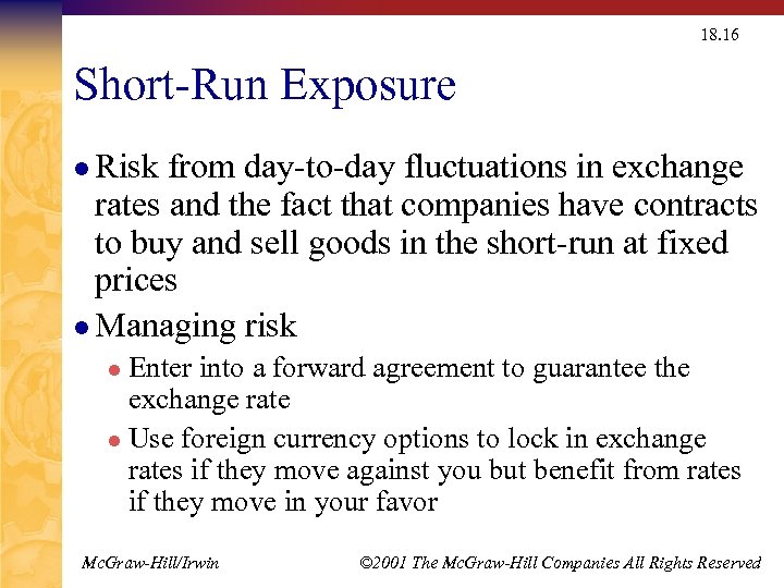 18. 16 Short-Run Exposure l Risk from day-to-day fluctuations in exchange rates and the fact that companies have contracts to buy and sell goods in the short-run at fixed prices l Managing risk Enter into a forward agreement to guarantee the exchange rate l Use foreign currency options to lock in exchange rates if they move against you but benefit from rates if they move in your favor l Mc. Graw-Hill/Irwin © 2001 The Mc. Graw-Hill Companies All Rights Reserved