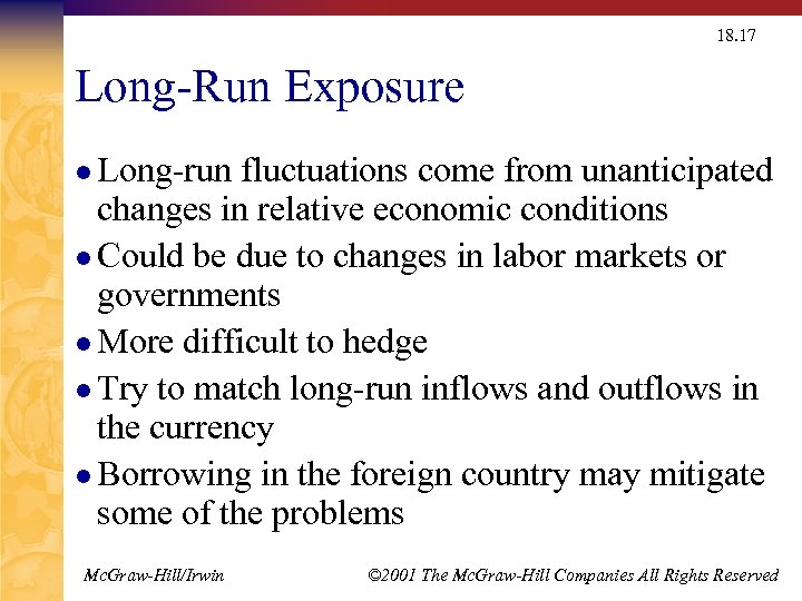 18. 17 Long-Run Exposure l Long-run fluctuations come from unanticipated changes in relative economic conditions l Could be due to changes in labor markets or governments l More difficult to hedge l Try to match long-run inflows and outflows in the currency l Borrowing in the foreign country may mitigate some of the problems Mc. Graw-Hill/Irwin © 2001 The Mc. Graw-Hill Companies All Rights Reserved