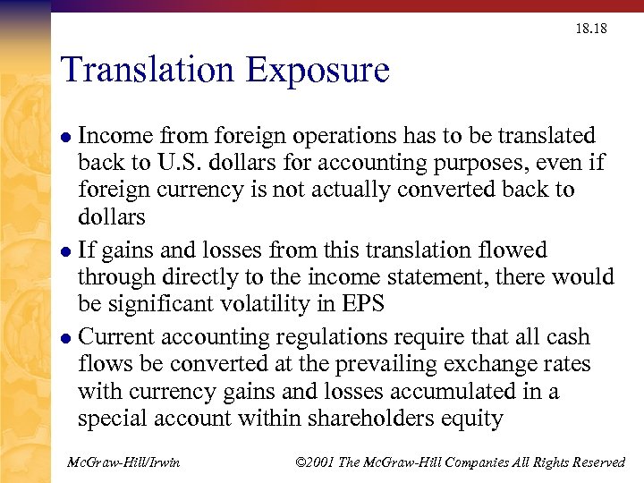 18. 18 Translation Exposure Income from foreign operations has to be translated back to U. S. dollars for accounting purposes, even if foreign currency is not actually converted back to dollars l If gains and losses from this translation flowed through directly to the income statement, there would be significant volatility in EPS l Current accounting regulations require that all cash flows be converted at the prevailing exchange rates with currency gains and losses accumulated in a special account within shareholders equity l Mc. Graw-Hill/Irwin © 2001 The Mc. Graw-Hill Companies All Rights Reserved