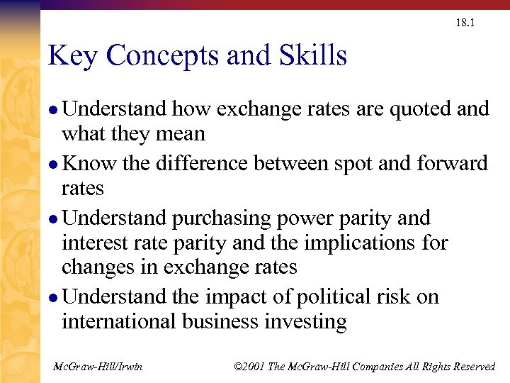 18. 1 Key Concepts and Skills l Understand how exchange rates are quoted and what they mean l Know the difference between spot and forward rates l Understand purchasing power parity and interest rate parity and the implications for changes in exchange rates l Understand the impact of political risk on international business investing Mc. Graw-Hill/Irwin © 2001 The Mc. Graw-Hill Companies All Rights Reserved