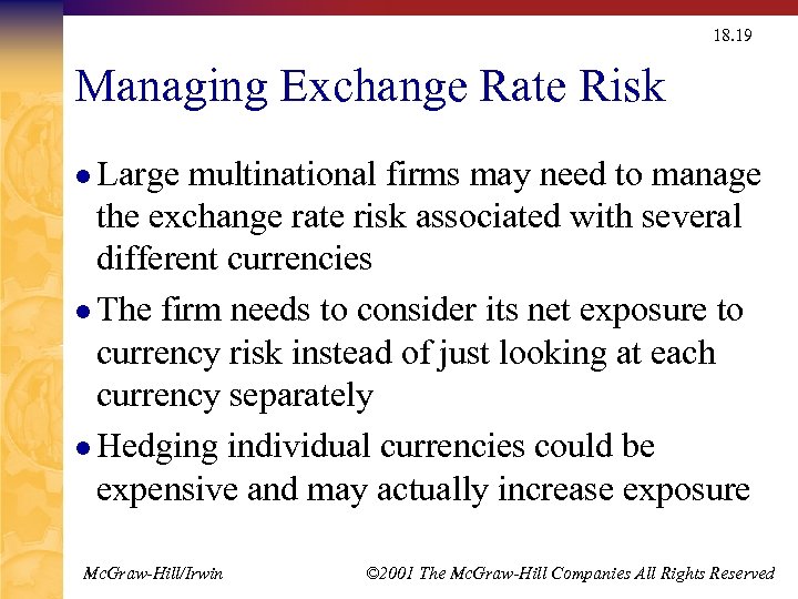 18. 19 Managing Exchange Rate Risk l Large multinational firms may need to manage the exchange rate risk associated with several different currencies l The firm needs to consider its net exposure to currency risk instead of just looking at each currency separately l Hedging individual currencies could be expensive and may actually increase exposure Mc. Graw-Hill/Irwin © 2001 The Mc. Graw-Hill Companies All Rights Reserved