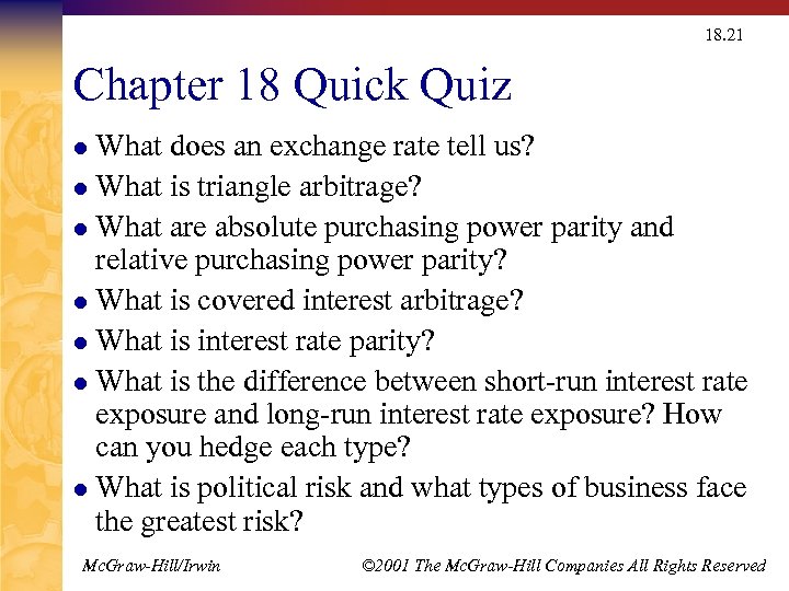 18. 21 Chapter 18 Quick Quiz What does an exchange rate tell us? l What is triangle arbitrage? l What are absolute purchasing power parity and relative purchasing power parity? l What is covered interest arbitrage? l What is interest rate parity? l What is the difference between short-run interest rate exposure and long-run interest rate exposure? How can you hedge each type? l What is political risk and what types of business face the greatest risk? l Mc. Graw-Hill/Irwin © 2001 The Mc. Graw-Hill Companies All Rights Reserved