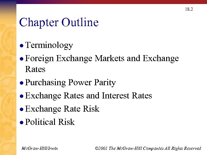 18. 2 Chapter Outline l Terminology l Foreign Exchange Markets and Exchange Rates l Purchasing Power Parity l Exchange Rates and Interest Rates l Exchange Rate Risk l Political Risk Mc. Graw-Hill/Irwin © 2001 The Mc. Graw-Hill Companies All Rights Reserved