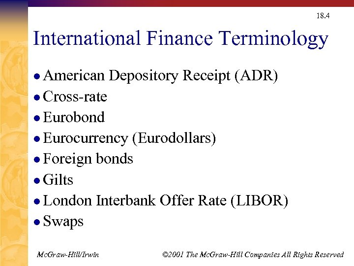 18. 4 International Finance Terminology l American Depository Receipt (ADR) l Cross-rate l Eurobond l Eurocurrency (Eurodollars) l Foreign bonds l Gilts l London Interbank Offer Rate (LIBOR) l Swaps Mc. Graw-Hill/Irwin © 2001 The Mc. Graw-Hill Companies All Rights Reserved