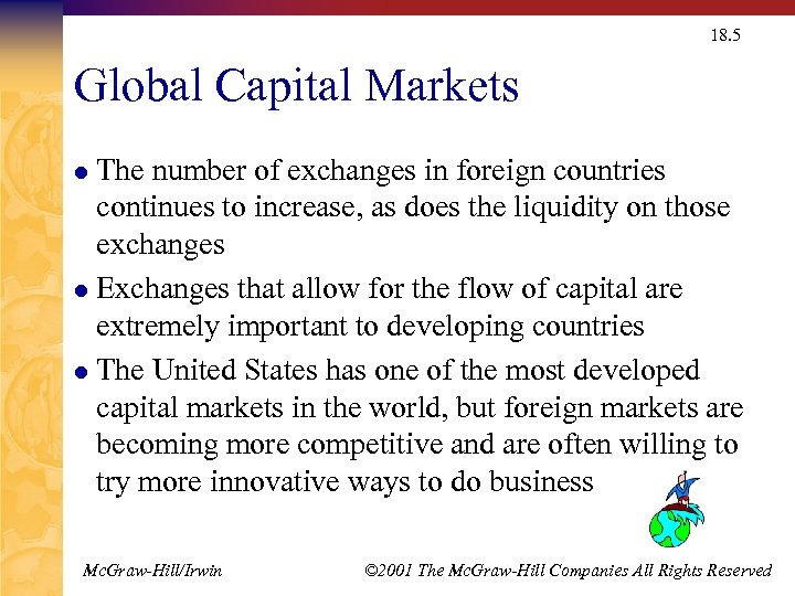 18. 5 Global Capital Markets The number of exchanges in foreign countries continues to increase, as does the liquidity on those exchanges l Exchanges that allow for the flow of capital are extremely important to developing countries l The United States has one of the most developed capital markets in the world, but foreign markets are becoming more competitive and are often willing to try more innovative ways to do business l Mc. Graw-Hill/Irwin © 2001 The Mc. Graw-Hill Companies All Rights Reserved