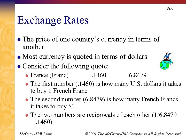 18. 6 Exchange Rates The price of one country’s currency in terms of another l Most currency is quoted in terms of dollars l Consider the following quote: l France (Franc). 1460 6. 8479 l The first number (. 1460) is how many U. S. dollars it takes to buy 1 French Franc l The second number (6. 8479) is how many French Francs it takes to buy $1 l The two numbers are reciprocals of each other (1/6. 8479 =. 1460) l Mc. Graw-Hill/Irwin © 2001 The Mc. Graw-Hill Companies All Rights Reserved