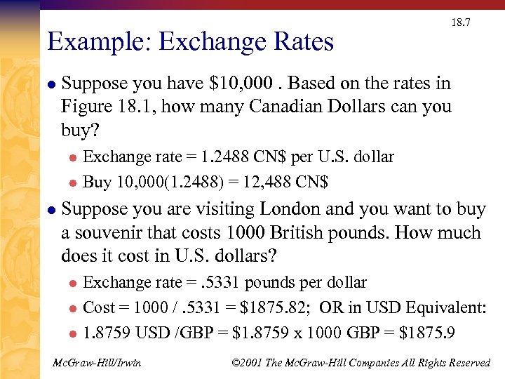 Example: Exchange Rates l 18. 7 Suppose you have $10, 000. Based on the rates in Figure 18. 1, how many Canadian Dollars can you buy? Exchange rate = 1. 2488 CN$ per U. S. dollar l Buy 10, 000(1. 2488) = 12, 488 CN$ l l Suppose you are visiting London and you want to buy a souvenir that costs 1000 British pounds. How much does it cost in U. S. dollars? Exchange rate =. 5331 pounds per dollar l Cost = 1000 /. 5331 = $1875. 82; OR in USD Equivalent: l 1. 8759 USD /GBP = $1. 8759 x 1000 GBP = $1875. 9 l Mc. Graw-Hill/Irwin © 2001 The Mc. Graw-Hill Companies All Rights Reserved
