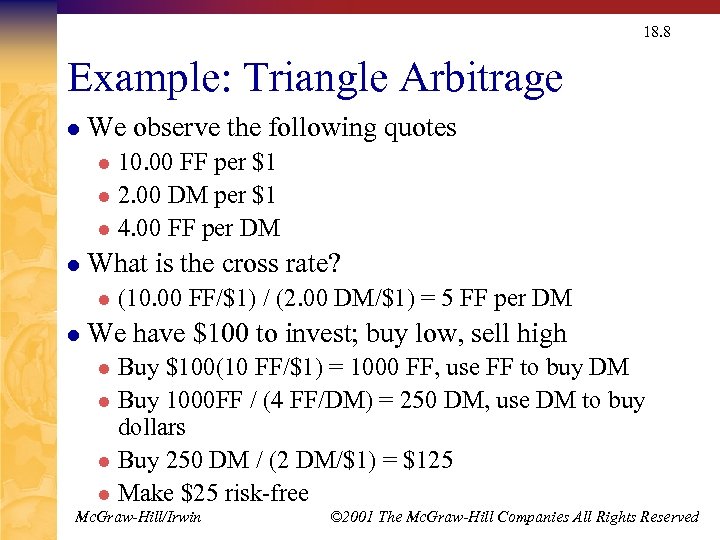 18. 8 Example: Triangle Arbitrage l We observe the following quotes 10. 00 FF per $1 l 2. 00 DM per $1 l 4. 00 FF per DM l l What is the cross rate? l l (10. 00 FF/$1) / (2. 00 DM/$1) = 5 FF per DM We have $100 to invest; buy low, sell high Buy $100(10 FF/$1) = 1000 FF, use FF to buy DM l Buy 1000 FF / (4 FF/DM) = 250 DM, use DM to buy dollars l Buy 250 DM / (2 DM/$1) = $125 l Make $25 risk-free l Mc. Graw-Hill/Irwin © 2001 The Mc. Graw-Hill Companies All Rights Reserved