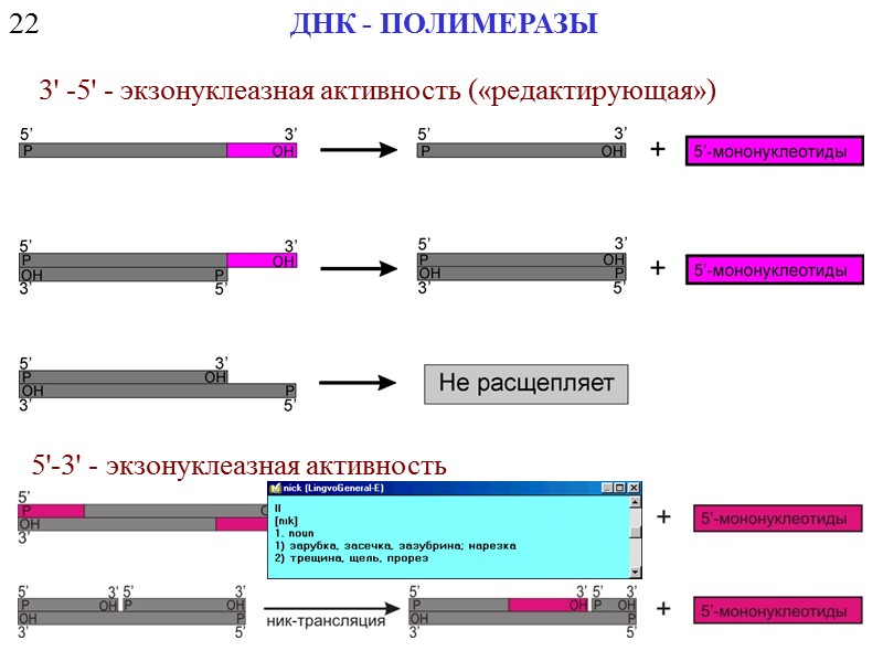 22 ДНК - ПОЛИМЕРАЗЫ 3' -5' - экзонуклеазная активность («редактирующая») 5'-3' - экзонуклеазная активность