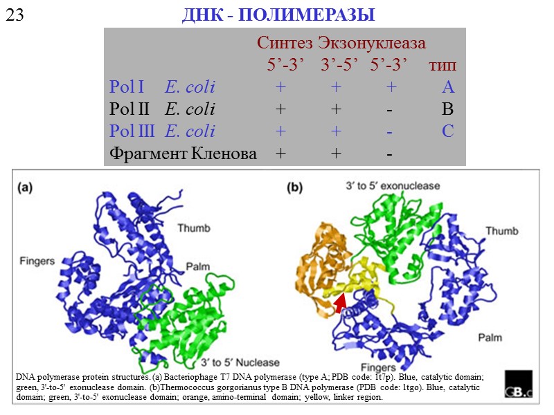 23 ДНК - ПОЛИМЕРАЗЫ Синтез Экзонуклеаза 5’-3’ 3’-5’ 5’-3’ тип Рol I E. coli + + + A Pol II E. coli + + - B Pol III E. coli + + - C Фрагмент Кленова + + - DNA polymerase protein structures. (a) Bacteriophage T7 DNA polymerase (type A; PDB code: 1t7p). Blue, catalytic domain; green, 3'-to-5' exonuclease domain. (b)Thermococcus gorgorianus type B DNA polymerase (PDB code: 1tgo). Blue, catalytic domain; green, 3'-to-5' exonuclease domain; orange, amino-terminal domain; yellow, linker region.