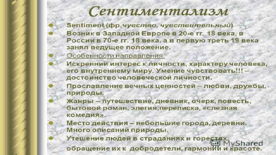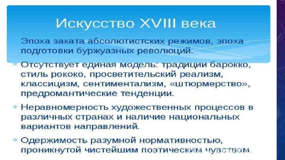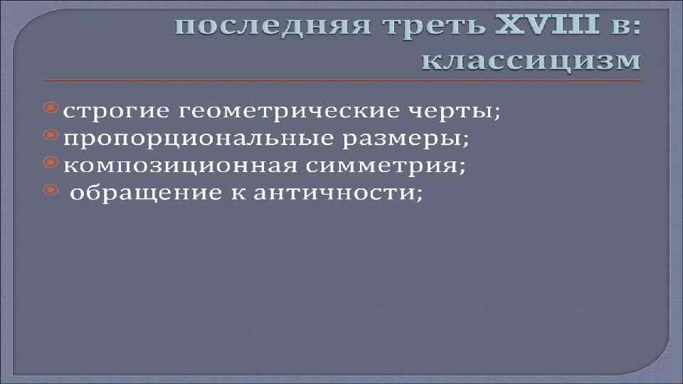 Основным литературным направлением XVIII в. был классицизм. Классицизм – художественный стиль и эстетическое направление в европейской культуре XVII – начала XIX в. , одной из важнейших черт которого являлось обращение к образцам и формам античности как к универсальному эталону. Классицизм связан со временем утверждения крепкого централизованного государства – абсолютной монархии.