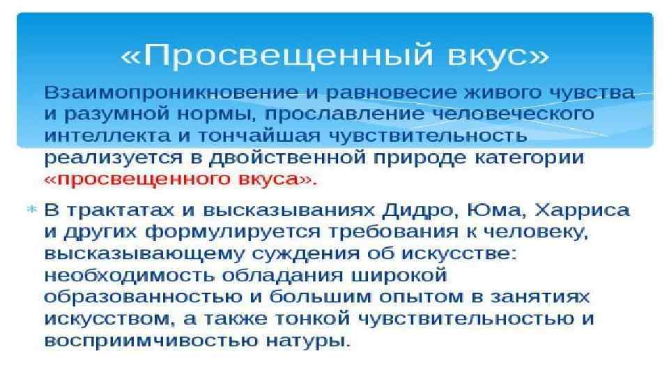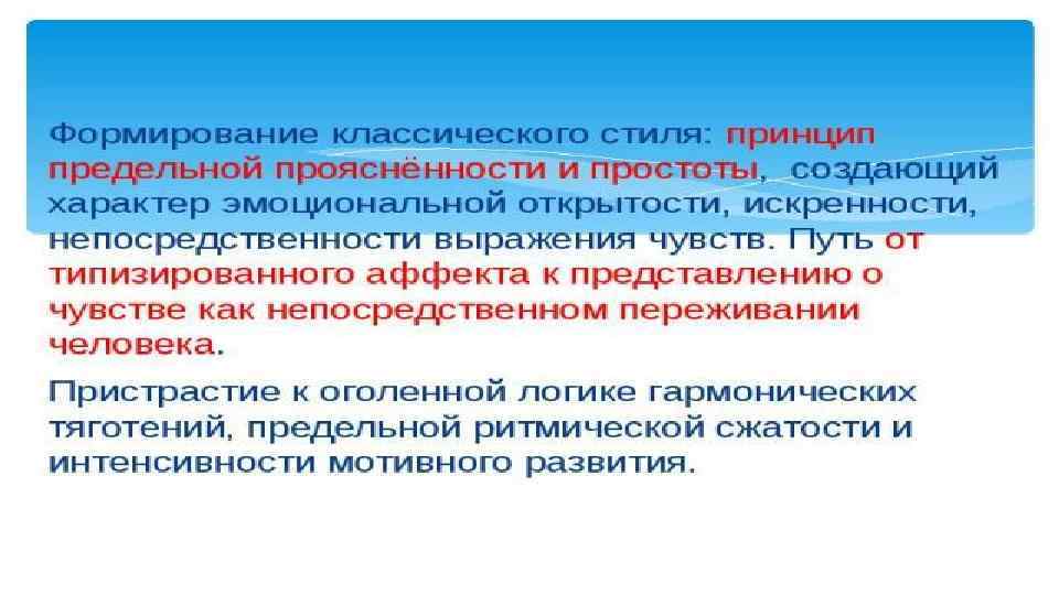 Понятие прекрасного в искусстве классицизма связано с симметрией и гармонией. Это отражалось и в правилах поведения людей светского общества: бурное выражение чувств почиталось в XVIII столетии неприличным и воспринималось как признак низкого происхождения или дурного воспитания. Проявление даже самых сильных страстей должно было быть подобно глубоким водам, заключённым в гранитные берега.