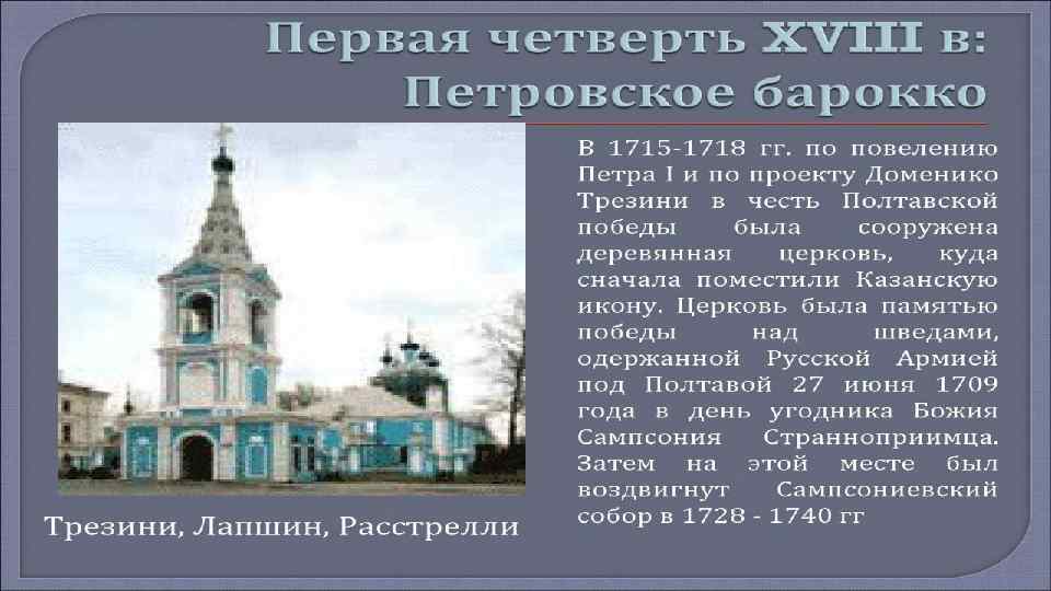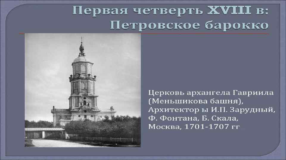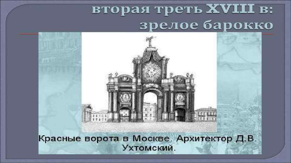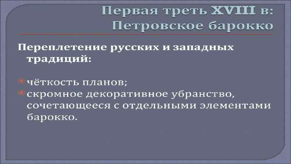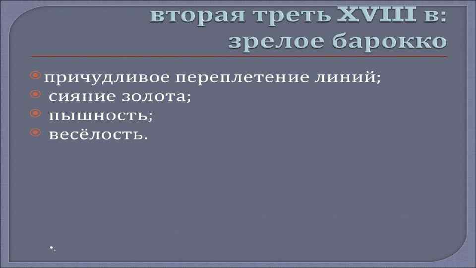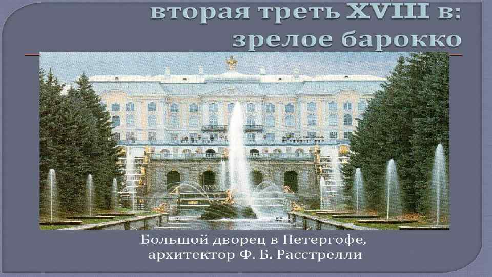 • Русская архитектура 18 века связанна преимущественно с тремя архитектурными направлениями. Это, прежде всего барокко, рококо и классицизм. • • Барокко – направление в искусстве, основными чертами которого является пышность, контрастность, а так же совмещение реальности и иллюзий. Мастера работы в стиле барокко, оставили большой след в русской архитектуре 18 века. • • Фамилии Трезини, Шлютера, Мичетти, Земцова, Растрелли, Чеванского и Ухтомского навсегда остались в истории русской архитектуры. Стоит отметить, что ансамбли Зимнего дворца, дворца Строгановых, Смольного монастыря, Царского села и оформление Петергофа – это шедевры произведения стиля барокко.