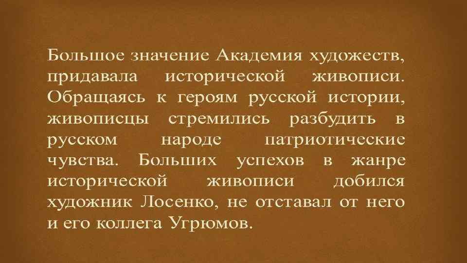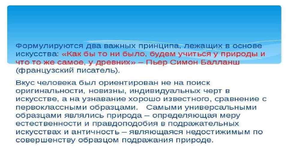 Главная задача классицизма – создание значительного монументального искусства, одушевлённого идеей сплочения нации, объединяющейся вокруг трона. Частный интерес подчинён в классицизме государственному, чувства – долгу.