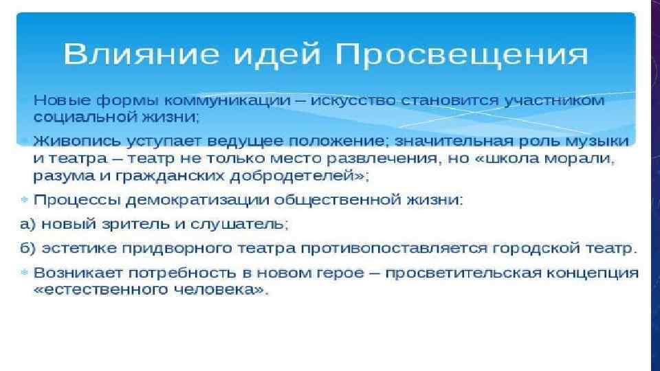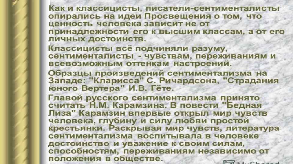 2) 60 -е гг. - конец XVIII в. На первый план выдвигаются задачи воспитания человека – гражданина. Произведения гневно обличают личные пороки, препятствующие служению человека на пользу государства. 3) конец XVIII в. - начало XIX в. Наблюдается спад классицизма. Усиливаются национальные мотивы. Писателей интересует уже не просто тип идеального дворянина, а тип русского идеального дворянина. Таким образом, русский классицизм на всех этапах отличала высокая гражданственность.