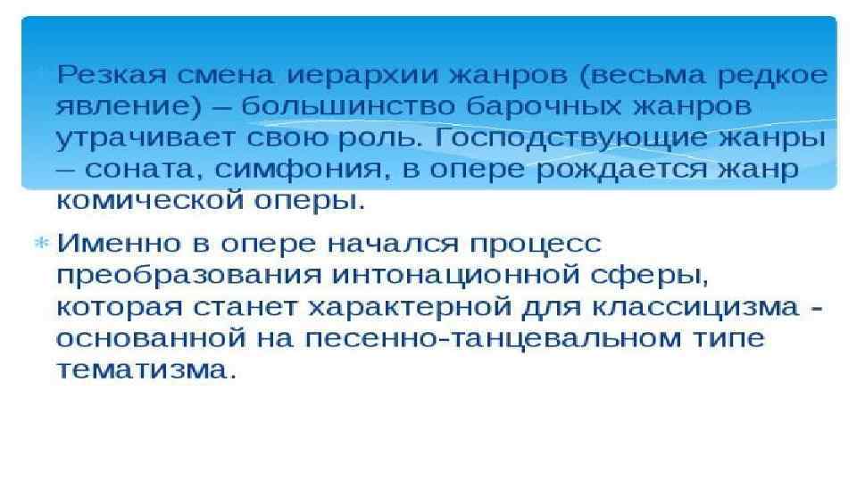 В драматургии господствовало требование трёх единств: - места (должно было быть одно место действия); - времени (действие разворачивалось в течение 24 часов); - действия (выделялся один основной сюжет, не было побочных коллизий и персонажей).