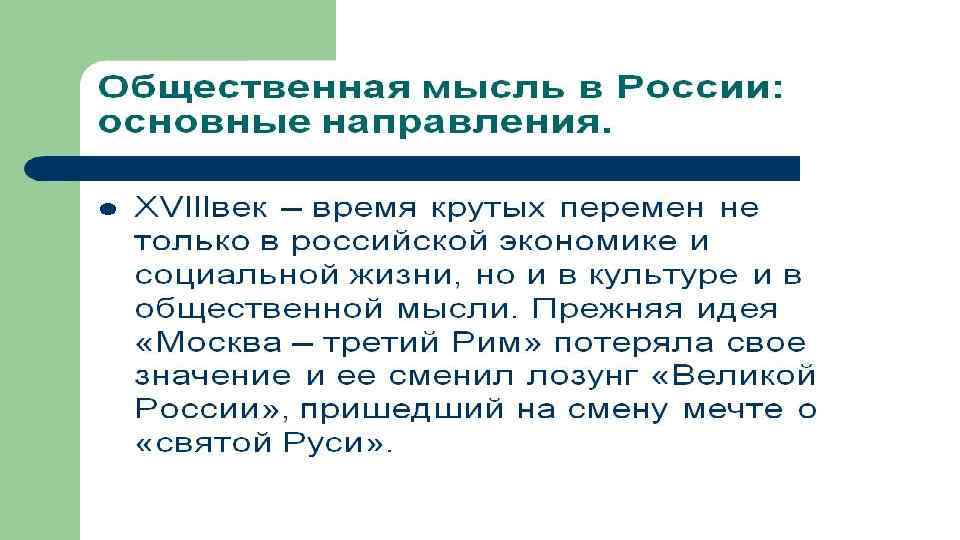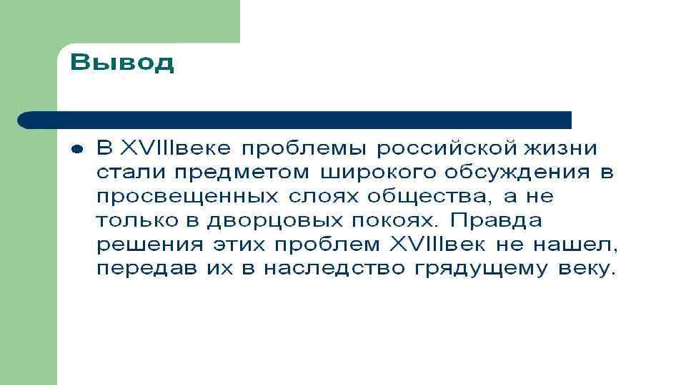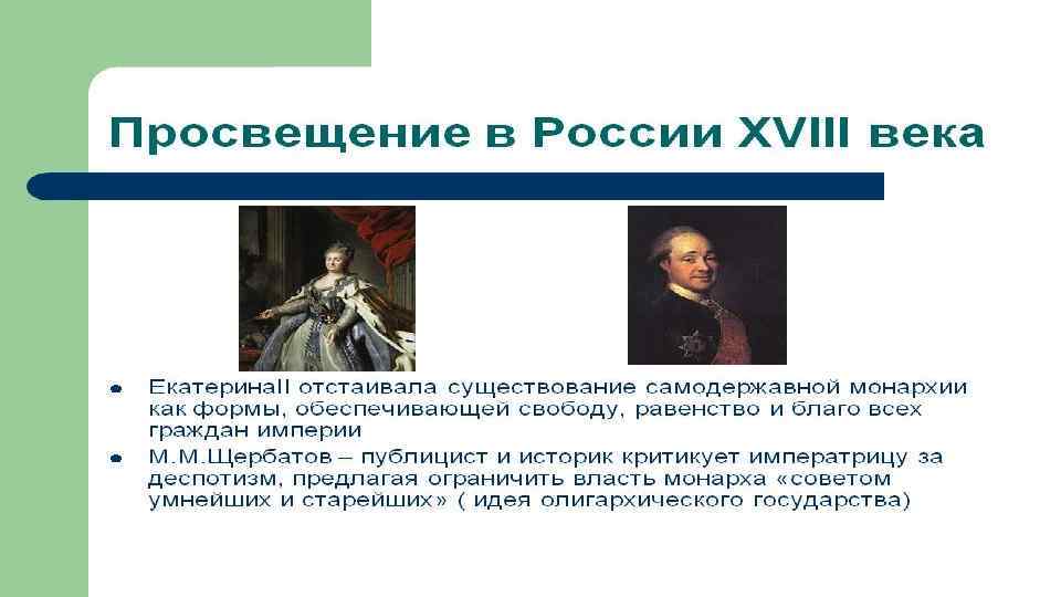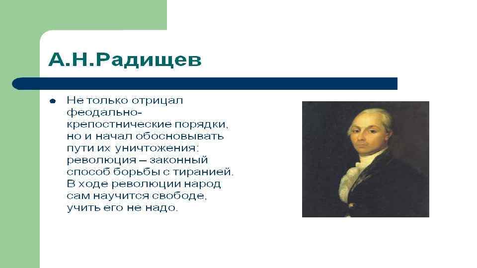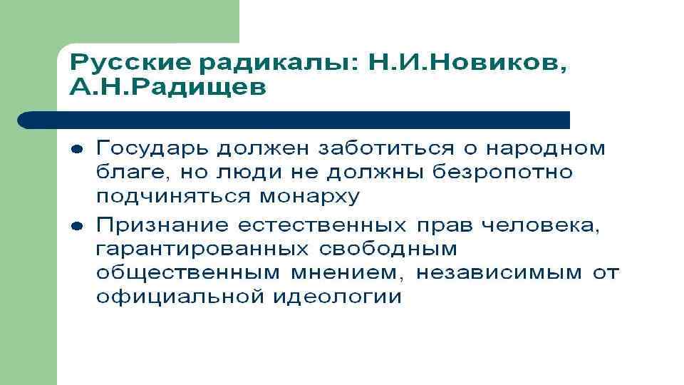 А. Н. РАДИЩЕВ НАЗВАЛ XVIII СТОЛЕТИЕ, С ОДНОЙ СТОРОНЫ, «БЕЗУМНЫМ» , А С ДРУГОЙ СТОРОНЫ – «МУДРЫМ» . КАК ВЫ ДУМАЕТЕ, ПОЧЕМУ? Кровопролитные войны, жестоко подавленное восстание Пугачёва, усиление крепостничества – с одной стороны; создание первого русского университета, культ науки и просвещения, преобразования в государственной жизни России – с другой.