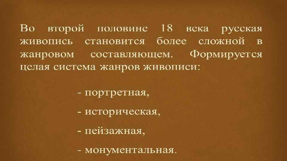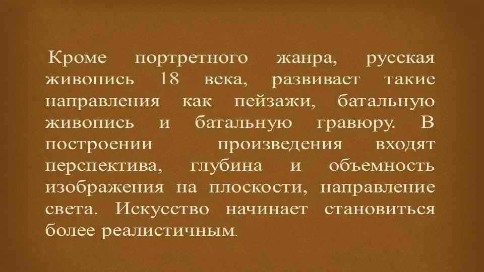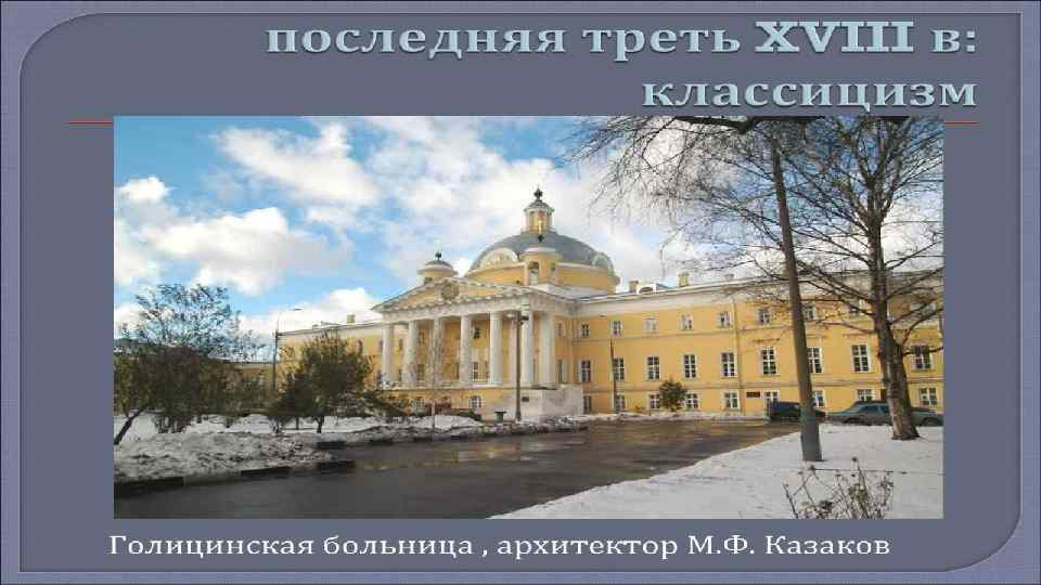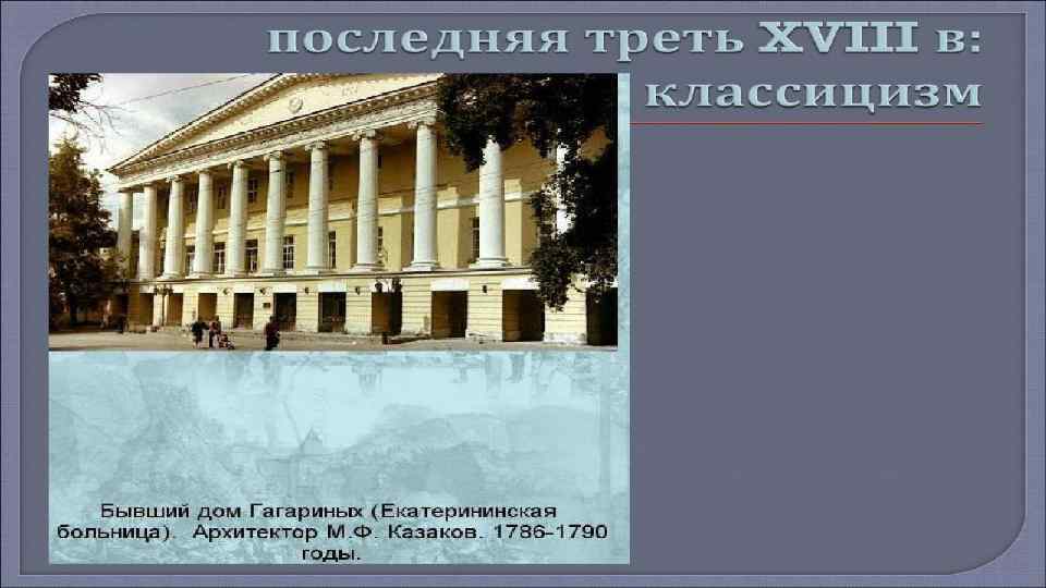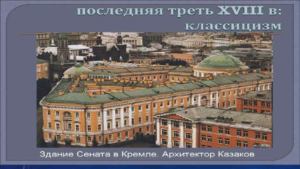 • Рококо – архитектурный стиль, который возник путем сочетания барокко и классицизма. Этот стиль несет в себе утонченность и галантность и характерен в основном для оформления интерьеров. • В 18 веке, в русской архитектуре, происходит становление нового явления – «русского классицизма» . Русский классицизм – это направление архитектуры, для которого характерна простота и строгость, а так же рациональность. Большое количество построек в стиле русского классицизма находилось в Москве. Дом Пашкова, Царицынский комплекс Бажева, здания Сената, дом князя Голицына и многие другие здания. Сегодня все они являются памятниками русской архитектуры 18 века.