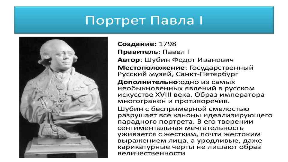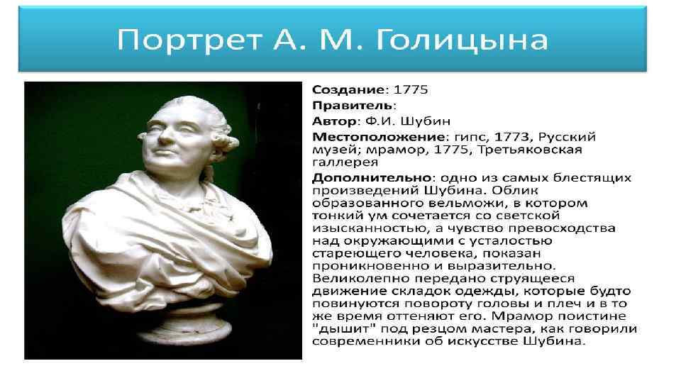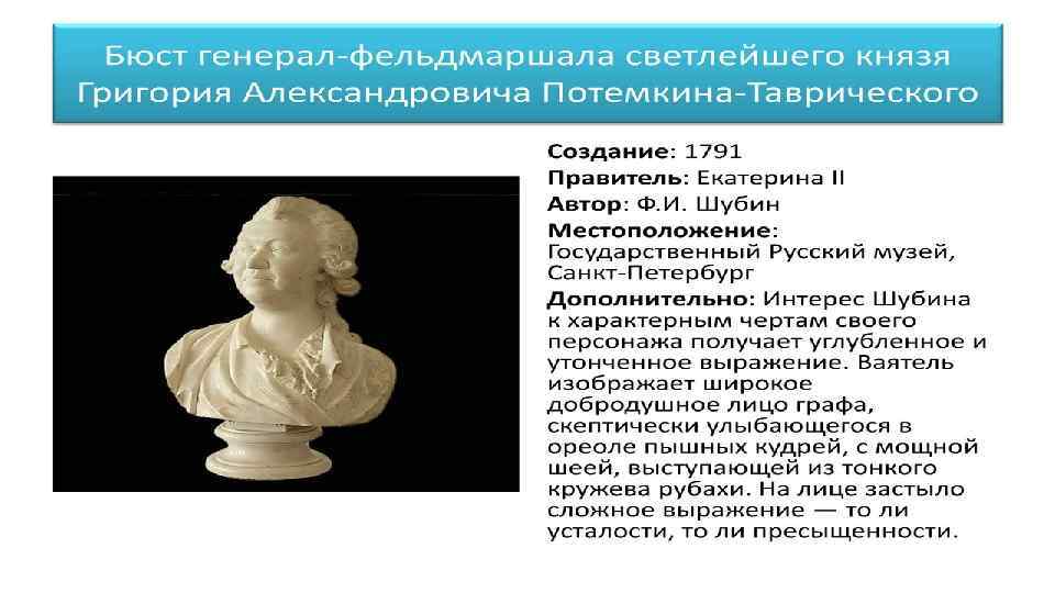• Скульптура XVIII века Во второй половине XVIII столетия начинается неуклонный расцвет отечественной пластики. Круглая скульптура развивалась до этого медленно, С трудом преодолевая восьмисотлетние древнерусские традиции в отношении к языческому «болвану» . Она не дала ни одного большого русского мастера в первой половине XVIII в. , но тем блистательнее был её взлёт в следующий период. Русский классицизм как ведущее художественное направление этой поры явился величайшим стимулом для развития искусства больших гражданских идей, что и обусловило интерес к ваянию в этот период. Ф. И. Шубин, Ф. Г. Гордеев, М. И. Козловский, Ф. Ф. Щедрин, И. П. Прокофьев, И. П. Мартос – каждый сам по себе был ярчайшей индивидуальностью, оставил свой, лишь ему свойственный след в искусстве. Но всех их объединяли общие творческие принципы, которые они усвоили ещё в Академии в классе скульптур профессора Никола Жилле. Русских художников объединяли также общие идеи гражданственности и патриотизма, высокие идеалы античности. Интерес к “героической античности” влияет и на выбор богов и героев: на смену излюбленным впетровское время Нептунам и Вакхам приходят Прометей, Поликрат, Марсий, Геркулес, Александр Македонский, герои гомеровского эпоса. Русские скульпторы стремятся воплотить в мужском образе черты героической личности, а в женском – идеально прекрасное, гармонически ясное, совершенное начало. Это прослеживается как в монументальной, архитектурна-декоративной, так и в станковой пластике. В отличие от барокко архитектурно-декоративная пластика в эпоху классицизма имеет страгую систему расположения на фасаде здания: в основном в центральной части, главном портике и в боковых ризалитах, или венчает здание, читаясь на фоне неба. Русская скульптура второй половины 18 века Рядом с ислючительной по значимости фигурой Шубина встает плеяда его выдающихся современников, как и он, способствовавших блестящему расцвету русской скульптуры во второй половине XVIII века. Вместе с отечественными мастерами славе российского ваяния немало способствовал скульптор Этьен-Морис Фальконе (1716__1791, в России — с 1766 по 1778), автор одного из лучших монументов XVIII века — памятника Петру I на Сенатской площади в Петербурге {ил. 161). Грандиозность задач, высота идейных и эстетических критериев, напряженность творческой атмосферы в русском искусстве тех лет позволили скульптору создать самое совершенное из его произведений, неразрывно связанное со страной, где оно родилось. Первоначальный эскиз был готов уже в 1765 году. Приехав в Петербург, Фальконе принялся за работу и к 1770 году закончил модель в натуральную величину. К месту установки памятника была доставлена каменная скала, весившая после ее частичной обрубки около 275 тонн. В 1775— 1777 годах происходила отливка статуи из бронзы, открытие же памятника состоялось в 1782 году. Помощницей Фальконе в работе над памятником была его ученица Мари-Анн Колло (1748— 1821), изваявшая голову Петра. После отъезда Фальконе установкой памятника руководил скульптор Ф. Г. Гордеев. Фальконе был иностранцем, однако он сумел так понять личность Петра и его роль в историческом развитии России, что созданный им монумент должен рассматриваться именно в рамках русской культуры, предопределившей данную скульптором проникновенную трактовку образа Петра.