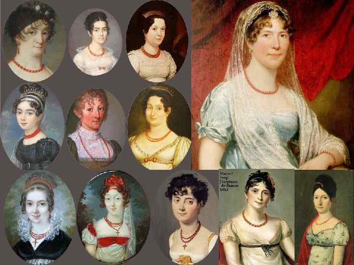 Украшения - Цепочки – в несколько рядов/в один, кулоны (камеи, портреты) на длинных цепочках - Кулоны - Бусы – кораллы, жемчуг, etc – в несколько рядов/в один, кулон/крестик на нижнем ряду - Колье (реже) – заполнено по всей длине - Наборы украшений по несколько предметов (для очень богатых): колье, серьги, гребень для волос, (браслеты), etc. Серьги – практически всегда капельки, часто не совпадали с украшением на шее