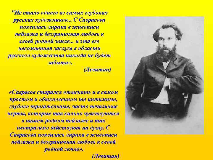 "Не стало одного из самых глубоких русских художников. . . С Саврасова появилась лирика в живописи пейзажа и безграничная любовь к своей родной земле. . . и эта его несомненная заслуга в области русского художества никогда не будет забыта» . (Левитан) «Саврасов старался отыскать и в самом простом и обыкновенном те интимные, глубоко трогательные, часто печальные черты, которые так сильно чувствуются в нашем родном пейзаже и так неотразимо действуют на душу. С Саврасова появилась лирика в живописи пейзажа и безграничная любовь к своей родной земле» . (Левитан)