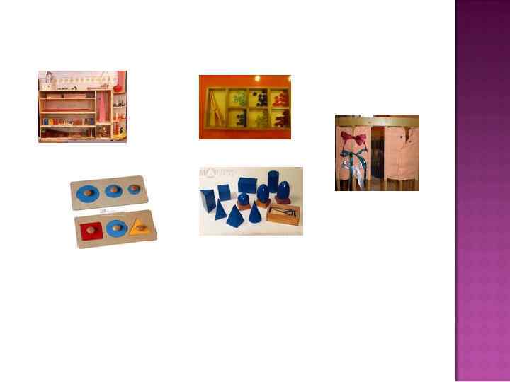 Дизайн Монтессори-материалов не менялся со дня создания, т. е. 100 лет. Для изготовления деревянных материалов применяются ценные сорта дерева, все материалы изготавливаются очень качественно, Сенсорное развитие Рамки с застежками - обучение конкретным, навыкам, необходимым при одевании. Детям предлагают рамки с пуговицами, кнопками, молнией, пряжками, шнурками, крючками, булавками и бантами. Коричневая лестница - представляет различия между двумя измерениями и знакомит с понятиями: тонкий, тоньше, самый тонкий; толстый, толще, самый толстый. Розовая башня - представляет различия величины в трех измерениях и помогает ребенку в дифференцировании понятий большой, больше, самый большой; маленький, меньше, самый маленький. Красные штанги - представляют различия величины в одном измерении (длины) и знакомят с понятиями: короткий, короче, самый короткий; длинный, длиннее, самый длинный. Блоки цилиндров - представляют собой четыре набора с девятью цилиндрами в каждом. Первый набор состоит из цилиндров различных по высоте; второй цилиндры различные по диаметру; два других включают цилиндры различные по высоте и по диаметру. Подбор цилиндра к соответствующему отверстию помогает в различении размера и развивает мелкую мускулатуру рук необходимую при письме. Цветные цилиндры Шумовые цилиндры