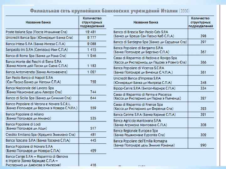 1893 – возникновение Банка Италии в результате слияния различных эмиссионных институтов 1892 – наделение Банка Италии функциями Центрального банка 1936 – первый Закон о банках 1992 – Закон Амато *