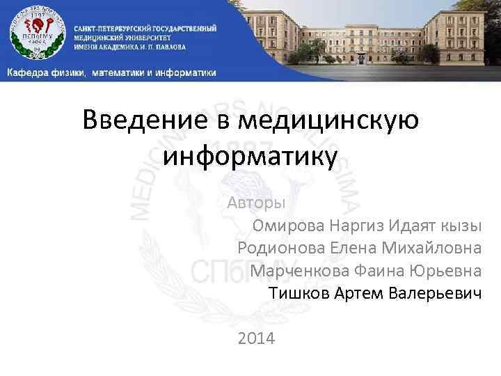 1897 ПСПб. ГМУ Кафедра ФМИ Введение в медицинскую информатику Авторы Омирова Наргиз Идаят кызы Родионова Елена Михайловна Марченкова Фаина Юрьевна Тишков Артем Валерьевич 2014