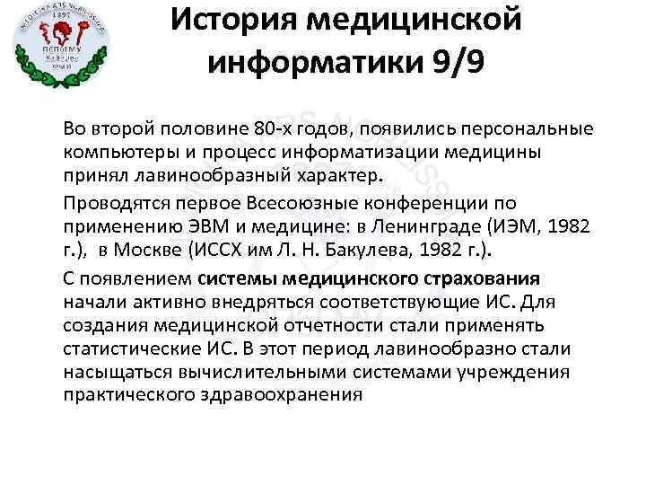 1897 ПСПб. ГМУ Кафедра ФМИ История медицинской информатики 9/9 Во второй половине 80 -х годов, появились персональные компьютеры и процесс информатизации медицины принял лавинообразный характер. Проводятся первое Всесоюзные конференции по применению ЭВМ и медицине: в Ленинграде (ИЭМ, 1982 г. ), в Москве (ИССХ им Л. Н. Бакулева, 1982 г. ). С появлением системы медицинского страхования начали активно внедряться соответствующие ИС. Для создания медицинской отчетности стали применять статистические ИС. В этот период лавинообразно стали насыщаться вычислительными системами учреждения практического здравоохранения