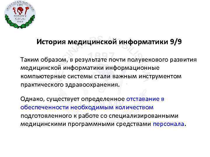 1897 ПСПб. ГМУ Кафедра ФМИ История медицинской информатики 9/9 Таким образом, в результате почти полувекового развития медицинской информатики информационные компьютерные системы стали важным инструментом практического здравоохранения. Однако, существует определенное отставание в обеспеченности необходимым количеством подготовленного к работе со специализированными медицинскими программными средствами персонала.