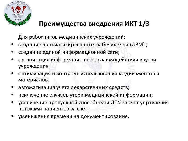 1897 ПСПб. ГМУ Кафедра ФМИ • • Преимущества внедрения ИКТ 1/3 Для работников медицинских учреждений: создание автоматизированных рабочих мест (АРМ) ; создание единой информационной сети; организация информационного взаимодействия внутри учреждения; оптимизация и контроль использования медикаментов и материалов; автоматизация учета лекарственных средств; исключение случаев утери медицинской информации; увеличение пропускной способности ЛПУ за счет управления потоками пациентов за счёт; уменьшения времени на документирование.