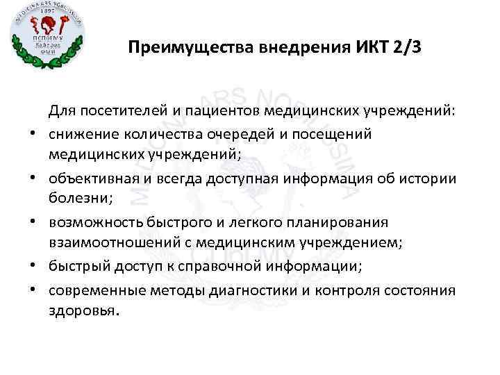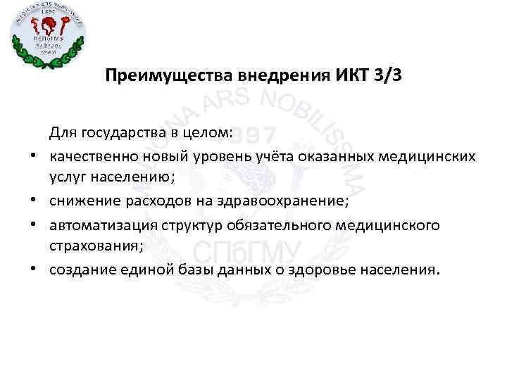 1897 ПСПб. ГМУ Кафедра ФМИ Преимущества внедрения ИКТ 3/3 • • Для государства в целом: качественно новый уровень учёта оказанных медицинских услуг населению; снижение расходов на здравоохранение; автоматизация структур обязательного медицинского страхования; создание единой базы данных о здоровье населения.
