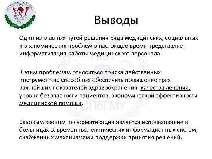 1897 ПСПб. ГМУ Кафедра ФМИ Выводы Один из главных путей решения ряда медицинских, социальных и экономических проблем в настоящее время представляет информатизация работы медицинского персонала. К этим проблемам относиться поиска действенных инструментов, способных обеспечить повышение трех важнейших показателей здравоохранения: качества лечения, уровня безопасности пациентов, экономической эффективности медицинской помощи. Базовым звеном информатизации является использование в больницах современных клинических информационных систем, снабженных механизмами поддержки принятия решений.