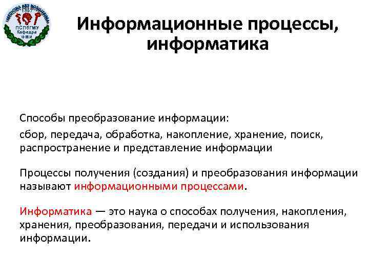 1897 ПСПб. ГМУ Кафедра ФМИ Информационные процессы, информатика Способы преобразование информации: сбор, передача, обработка, накопление, хранение, поиск, распространение и представление информации Процессы получения (создания) и преобразования информации называют информационными процессами. Информатика — это наука о способах получения, накопления, хранения, преобразования, передачи и использования информации.