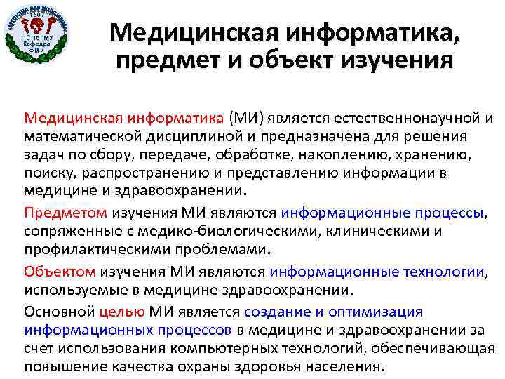 1897 ПСПб. ГМУ Кафедра ФМИ Медицинская информатика, предмет и объект изучения Медицинская информатика (МИ) является естественнонаучной и математической дисциплиной и предназначена для решения задач по сбору, передаче, обработке, накоплению, хранению, поиску, распространению и представлению информации в медицине и здравоохранении. Предметом изучения МИ являются информационные процессы, сопряженные с медико-биологическими, клиническими и профилактическими проблемами. Объектом изучения МИ являются информационные технологии, используемые в медицине здравоохранении. Основной целью МИ является создание и оптимизация информационных процессов в медицине и здравоохранении за счет использования компьютерных технологий, обеспечивающая повышение качества охраны здоровья населения.