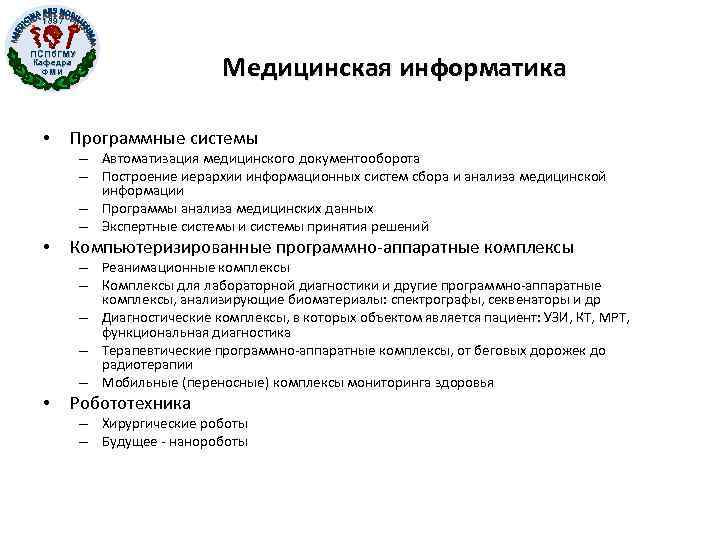 1897 ПСПб. ГМУ Медицинская информатика Кафедра ФМИ • Программные системы – Автоматизация медицинского документооборота – Построение иерархии информационных систем сбора и анализа медицинской информации – Программы анализа медицинских данных – Экспертные системы и системы принятия решений • Компьютеризированные программно-аппаратные комплексы – Реанимационные комплексы – Комплексы для лабораторной диагностики и другие программно-аппаратные комплексы, анализирующие биоматериалы: спектрографы, секвенаторы и др – Диагностические комплексы, в которых объектом является пациент: УЗИ, КТ, МРТ, функциональная диагностика – Терапевтические программно-аппаратные комплексы, от беговых дорожек до радиотерапии – Мобильные (переносные) комплексы мониторинга здоровья • Робототехника – Хирургические роботы – Будущее - нанороботы