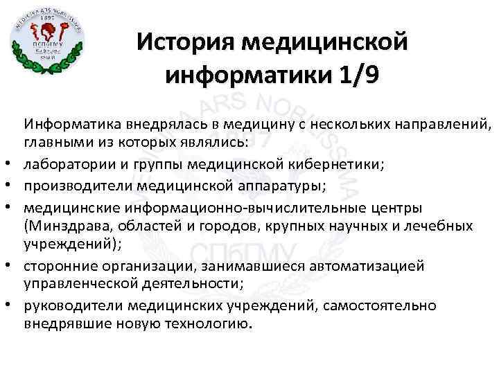 1897 ПСПб. ГМУ Кафедра ФМИ • • • История медицинской информатики 1/9 Информатика внедрялась в медицину с нескольких направлений, главными из которых являлись: лаборатории и группы медицинской кибернетики; производители медицинской аппаратуры; медицинские информационно-вычислительные центры (Минздрава, областей и городов, крупных научных и лечебных учреждений); сторонние организации, занимавшиеся автоматизацией управленческой деятельности; руководители медицинских учреждений, самостоятельно внедрявшие новую технологию.
