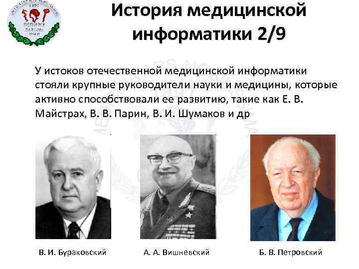 История медицинской информатики 2/9 1897 ПСПб. ГМУ Кафедра ФМИ У истоков отечественной медицинской информатики стояли крупные руководители науки и медицины, которые активно способствовали ее развитию, такие как Е. В. Майстрах, В. В. Парин, В. И. Шумаков и др В. И. Бураковский А. А. Вишневский Б. В. Петровский