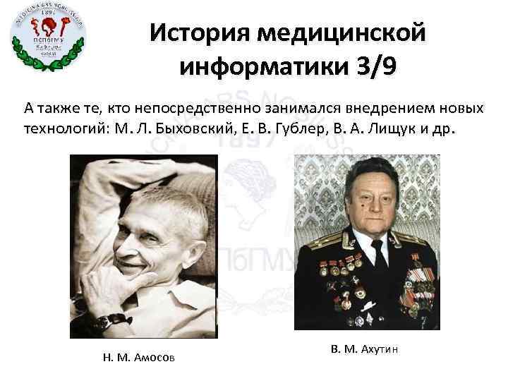 1897 ПСПб. ГМУ Кафедра ФМИ История медицинской информатики 3/9 А также те, кто непосредственно занимался внедрением новых технологий: М. Л. Быховский, Е. В. Гублер, В. А. Лищук и др. Н. М. Амосов В. М. Ахутин
