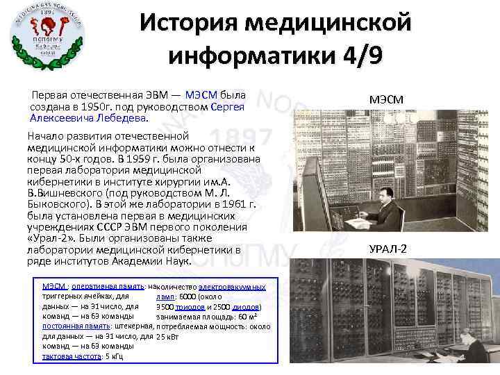 1897 ПСПб. ГМУ Кафедра ФМИ История медицинской информатики 4/9 Первая отечественная ЭВМ — МЭСМ была создана в 1950 г. под руководством Сергея Алексеевича Лебедева. Начало развития отечественной медицинской информатики можно отнести к концу 50 -х годов. В 1959 г. была организована первая лаборатория медицинской кибернетики в институте хирургии им. А. В. Вишневского (под руководством М. Л. Быковского). В этой же лаборатории в 1961 г. была установлена первая в медицинских учреждениях СССР ЭВМ первого поколения «Урал-2» . Были организованы также лаборатории медицинской кибернетики в ряде институтов Академии Наук. МЭСМ : оперативная память: на количество электровакуумных триггерных ячейках, для ламп: 6000 (около данных — на 31 число, для 3500 триодов и 2500 диодов) команд — на 63 команды занимаемая площадь: 60 м² постоянная память: штекерная, потребляемая мощность: около для данных — на 31 число, для 25 к. Вт команд — на 63 команды тактовая частота: 5 к. Гц МЭСМ УРАЛ-2