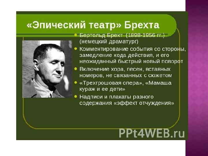 В 1933 -1947 годах в эмиграции. В 1949 году основал театр «Берлинер ансамбль» . В философско-сатирических пьесах на современные, исторические и мифологические сюжеты: «Трехгрошовая опера» (поставлена в 1928 году, музыка Курта Вейля, издана в 1931), «Мамаша Кураж и ее дети» (создана в 1939 году, издана в 1941); «Жизнь Галилея» (создана в 1938 -1939 годах, издана в 1955), «Добрый человек из Сезуана» (создана в 1938 -1940, издана в 1943); «Кавказский меловой круг» (поставлена в 1954, музыка Пауля Дессау, издана в 1949), с гуманистических, антифашистских позиций ставил остроактуальные проблемы. Брехт ориентировался, как и в собственной режиссуре, на разработанные им принципы «эпического театра» , предполагающего обращение не к традиционному «сопереживанию» , а к трезвому разуму и критическому анализу. Ввел так называемый эффект отчуждения — новый ракурс рассмотрения привычного, используя модернизированный аналог античного хора — песни-зонги, строя мизансцены по принципу кинокадра и т. п. Оказал влияние на театр 20 века. Международная Ленинская премия (1954).