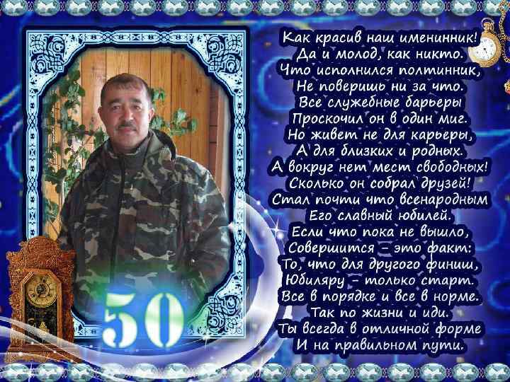 Юбилейың менән ҡотлайбыҙ Шатлыҡ-бәхет килһен эркелеп, Һинең көләсс күҙҙәреңдә Ҡояш нуры торһон һирпелеп. Оло йөрәкле һин, мәрхәмәтле Бар эшләгән эшең изгелек. Уңыштарҙан башың әйләнмәһен Бәхеттәрең булһын мәңгелек!