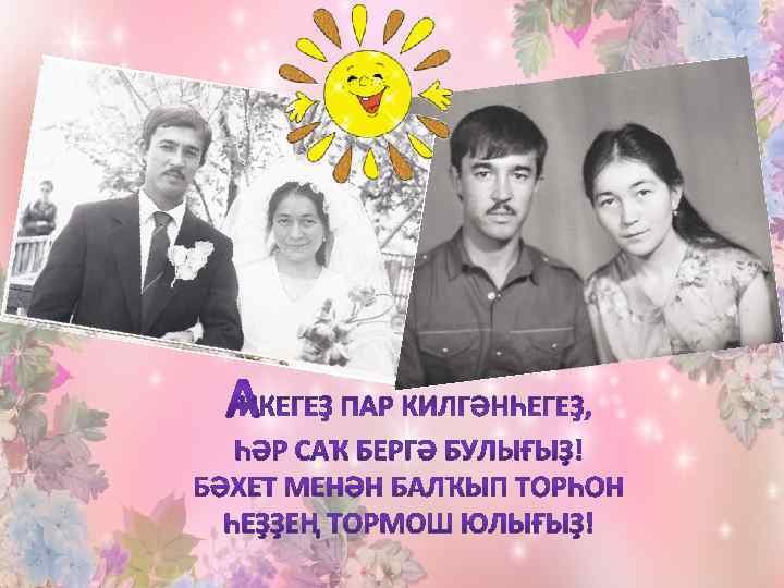 Ғүмереңдең яҡты киләсәген Алһыу таңдар аша ҡаршыла, Юлдарыңда булһын гел шатлыҡтар, Бәхет көтөп торһон ҡаршыңда. Ҙур уңыштар юлдаш булһын, Көндәреңде шатлыҡ биҙәһен. Сәләмәтлек-ярты бәхет, тиҙәр Ошо бәхет ситләп үтмәһен!
