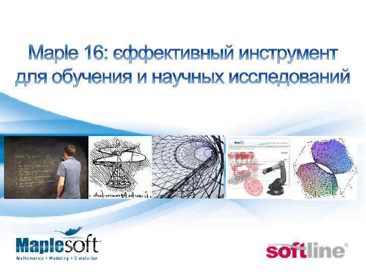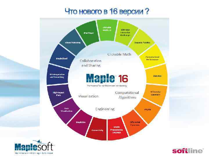 Математический аппарат § Лидер на мировом рынке средств для решения задач из всех отраслей математики § Знакомая математическая нотация, охвачены все области математики Новое в Maple 16 § Свыше 4500 дополнений и улучшений по всему продукту, новые алгоритмы мирового класса, а также увеличение скорости выполнения множества базовых операций